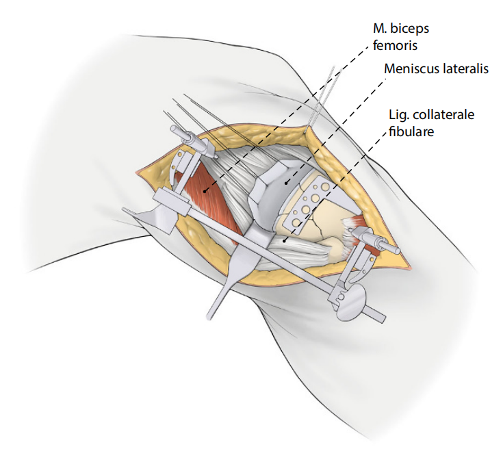在多个上述入路中,可沿关节间隙下方、经半月板胫骨韧带在半月板下方进行关节切开术。术中应保持半月板完整,并在手术过程中重新固定。该关节切开术可实现关节内视野,便于探查关节台阶。